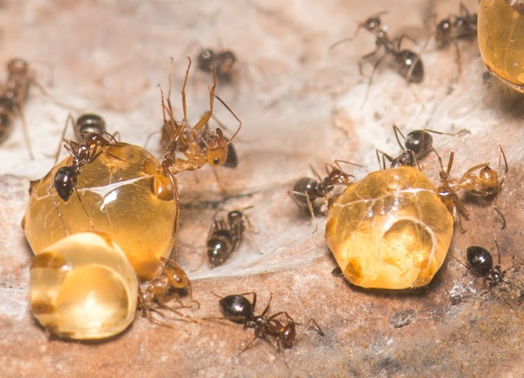 لا يقتصر دور هذا النمل على جمع الرحيق من الزهور فحسب، بل يستنزف أيضًا التسربات على ساق النبات (تسمى الندوة العسلية honeydew) ، إضافة إلى العسل الذي يتم إنتاجه من قِبل مصاصي نسغ النبات (الهيمتراتان) مثل حشرات المن والحشرات الماصة الأخرى.