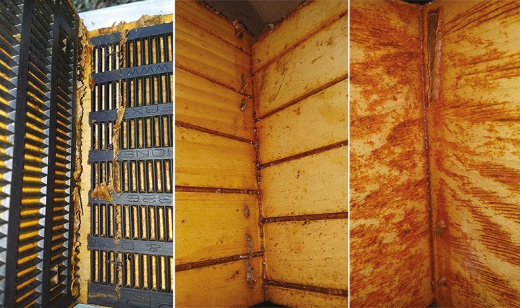 اختبر الباحثون في جورجيا ثلاث طرق مختلفة لتصميم الجدران الداخلية لقفير نحل العسل ( Apis mellifera ) لتحفيز إنتاج البروبوليس: على اليسار، يتم تثبيت مصائد عكبر بلاستيكية على الجدران. في الوسط، يتم تعديل الجدران بخمسة شقوق متوازية، 7 سنتيمترات، وقطع 3 ملليمترات في السطح؛ وعلى اليمين، يتم تخشين الجدران باستخدام فرشاة سلك ميكانيكية. جميع العلاجات الثلاثة حفزت زيادة إنتاج البروبوليس على الجدران الناعمة وغير المعدلة.