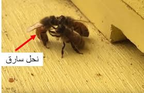 *عندما يقوم النحال بهذه الخلية التي تحدث بها السرقة يطير مئات من النحل السارق الى خارج الخلية بطريقة سريعة ومزعجة ثم يعاود السرقة بعد فتره قصيرة.