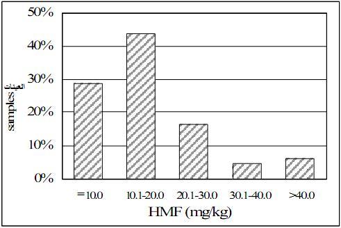 محتوى الـ HMF للـ 66 عينة المدروسة متقاربة تماماً (18,5 مع/كغ بالمتوسط)": 4 عينات تزيد عن الحد 40 مغ/كغ، وفقط 19 عينة (28,8%) تظهر قيم أخفض من 10 مغ/كغ (الشكل رقم 3) الممثل للعسل الغير مسخـّن طبقاً للمعاير الأساسية للنوعية(15). بما أن النشاط الأنزيمي مأخوذ بالاعتبار، هناك 6 عينات لها قيم دياستاز أخفض من 8 وحدات Schade، و 22 عينة لها قيم إنفرتاز أخفض من 5 IN، لكن بعضها (مع سيادة الحمضيات والفول) تظهر محتوى HMF منخفض، يمكن أن تصنف كأعسال منخفضة المحتوى الأنزيمي.