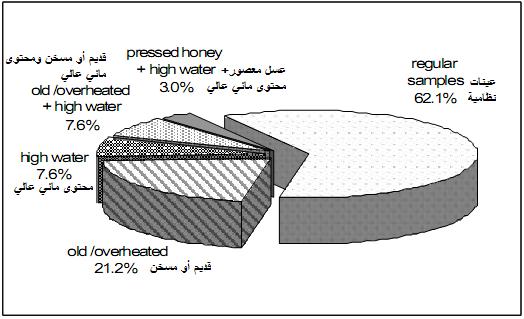 أظهرت معظم العينات محتوى مائي منخفض (القيمة الوسطى 16,5%) وعينة واحدة تجاوزت حدود الـ 20غ/100غ المحددة بالمعايير الدولية، كما أن 11 عينة أخرى (16,7%) لها قيم أعلى من 18غ/100غ (الشكل 1). هذا قد يكون سبباً للتخمر و، بتعميم أكثر، قصر عمر الرف(9). هذه القيم العالية يمكن أن تعود لقطف العسل قبل نضجه أو بسبب سوء التخزين.