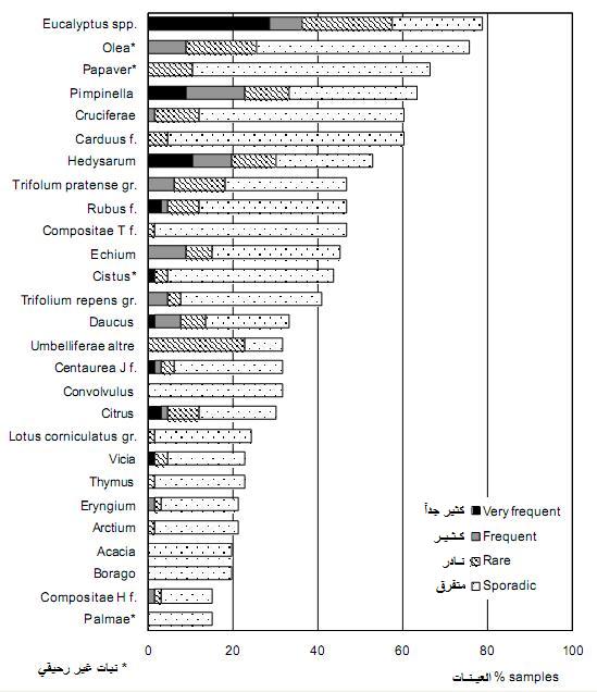 Eucalyptus spp., Umbelliferae (above all Pimpinella), Hedysarum, Cruciferae, Compositae (mainly Carduus), Trifolium spp وبدرجة أقلEchium, Rubus and Citrus (الشكل رقم 5).